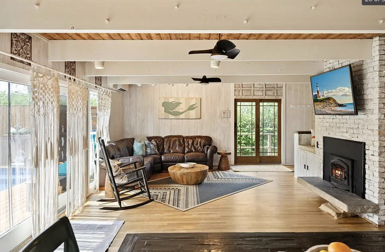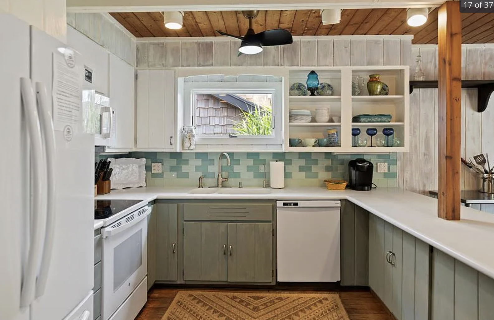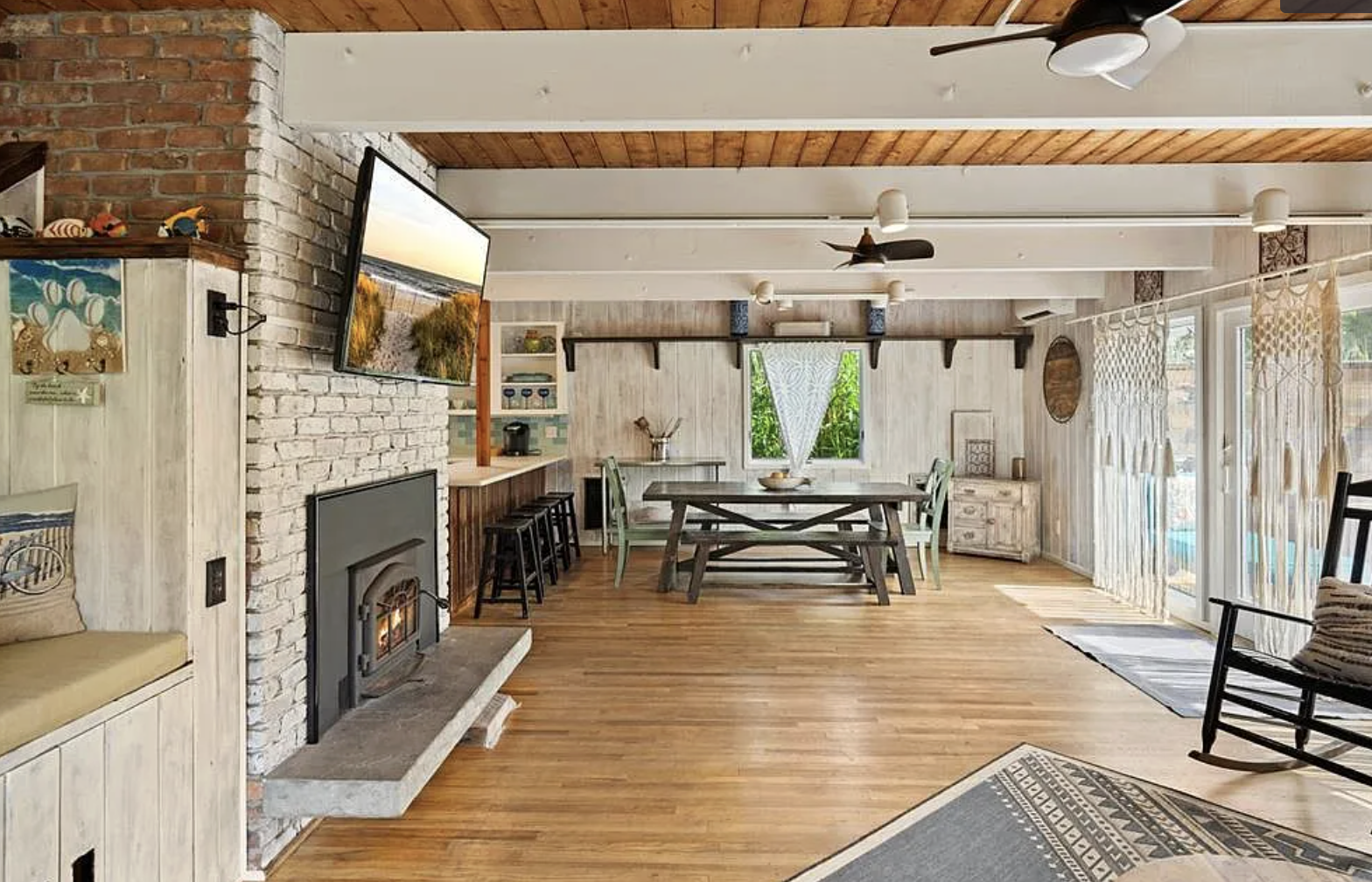 Inside, the layout flows exactly how you want it to. Open, airy, and filled with natural light, with cedar walls, hardwood floors, and a cozy brick fireplace anchoring the space. The kitchen is set up for slow mornings and easy hosting, with a dining bar that somehow always becomes the gathering spot.